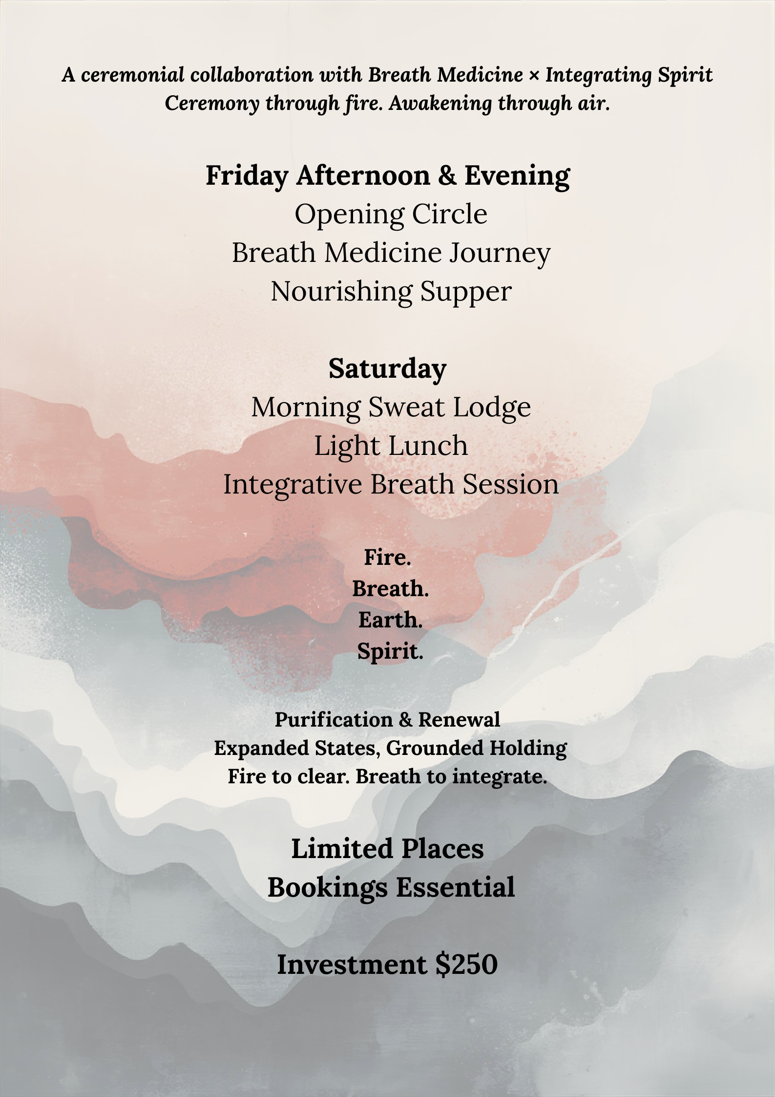 This gathering brings together the relational depth of Breath Medicine and the ceremonial grounding of Integrating Spirit — honouring both an ancient purification practice and contemporary breathwork.